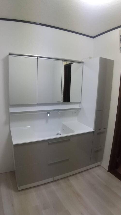 TOTO洗面化粧台オクターブ 施工ポイント 故障を機に買い替えのご要望。 TOTO洗面化粧台オクターブ(1500mm)に取替えました。 自動水栓で、水栓が上部に設置されているので、水垢がつきにくいです。 きれい除菌水は歯ブラシや排水口の菌を抑えることができます。 スイング三面鏡は、手前に鏡を出すことができるので、楽な姿勢で鏡を見れますよ。 トールキャビネットもご希望で取付けました。